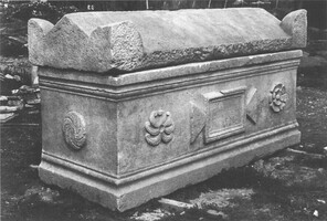 Le sarcophage, entièrement préservé, reposait à une profondeur de 1,65 m par rapport à la chaussée (long. 2,24-2,34 m ; larg. 0,97-1 m ; haut. 1,30 m). Il portait une tabula ansata sur le long côté, bordée d’une rosette et d’une boule de feu. Les petits côtés étaient ornés d’une spirale végétale et d’une boule de feu. La couverture était à double pente et ornée d’acrotères. La cuve contenait un squelette et une inhumation secondaire, mais aucun mobilier.