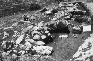 La zone fouillée se trouve entre le rempart Nord/Nord-Ouest de la ville et la chapelle d’Aï-Lias. Les vestiges mis au jour sont des murs appartenant à des maisons (fig. 2). À l’intérieur de ces maisons, la fouille a principalement recueilli des fragments de tuiles de couverture. Dans le même secteur, on a mis au jour des tombes à ciste de longueur variant entre 1,30 et 2,04 m, et d’orientation Est-Ouest. Le mobilier contenu dans les tombes compte un peson en terre cuite, des perles en verre, quelques rares tessons de vases, dont un à relief, un fragment de passoire (ethmos), un fragment de pithos et un fragment de fusaïole.