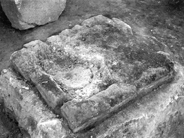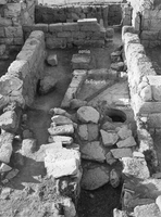 Sur le site antique d’Halos, Z. Malakassioti (XIIIe éphorie des antiquités préhistoriques et classiques) et R. Reinders (Institut néerlandais à Athènes) ont poursuivi en 2004 la fouille systématique dans le secteur de la porte Sud-Est du rempart de la ville hellénistique (fig. 1). La jonction des sondages et la fouille de quinze bermes a permis de dégager complètement les pièces qui appartenaient à la deuxième phase d’occupation du secteur. Il ressort de ces travaux qu’après sa destruction en 265 av. J.-C., cet espace a continué à être occupé et que des murs ont été bâtis afin de le réorganiser. Trois pithoi de grandes dimensions ont été trouvés en place, dans la cour où on a aussi mis au jour un foyer orthogonal, délimité par de petites briques (fig. 2). L’intérieur du foyer comportait une grande quantité de cendres, ainsi que des graines calcinées (fèves, pois chiches, lentilles, petits pois, orge, blé). Les nettoyages près du rempart ont livré un trésor de 35 monnaies qui datent des XIe-XIIe s. apr. J.-C. D’après l’ensemble des 250 monnaies trouvées jusqu’alors dans le secteur de la porte Sud-Est, il ressort que l’occupation s’est poursuivie entre 260 et 220 av. J.-C.