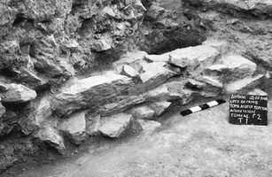 Dans le secteur C, on a dégagé un segment de mur d’une maison (long. 1,75 m ; larg. 0,60 m ; haut. 0,35 m ; fig. 3), construit en blocs de taille moyenne. Le mobilier indique une datation à l’époque mycénienne (HR III C ). Une tombe à ciste d’enfant (long. 0,72 m ; larg. 0,35 m), fouillée à proximité, avait été pillée.