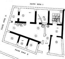Makrigianni (New Acropolis Museum plot). S. Eleftheratou (Α’ ΕΠΚΑ) reports on further excavation in the southern section of the plot ahead of the placing of a supporting column for the museum (Fig. 1). The western part of a room (ca. 4 x 5m) off the southeast courtyard of House Θ was investigated; it belonged to the building’s sixth-century AD phase, with walls typical for the period in rough stones with bands of brick and mortar. A Middle Byzantine storage construction removed the floor of the room, but excavation beneath revealed phases from the fifth century BC to the third century AD. In Classical and Hellenistic times, the area consisted of a smaller room (10) and an elongated space to its west (9) (Fig. 2), the north part of which had previously been investigated. The room lies to the south of the vestibule (8) and the andron (7) and communicates directly with them. The southern boundary was outside the excavated area and reconstruction (Fig. 2) is therefore hypothetical. Area 9 probably constituted the main access corridor to the house from the street to the south. The walls of these new areas preserved foundations of dressed limestone blocks in polygonal masonry, which remained in use until the late Hellenistic period when House Θ was destroyed, perhaps during the Sullan sack of 86 BC.