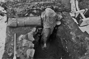 Work on the northwest edge of the plot for the construction of the large entrance stairway to the Museum (Fig. 4) revealed the north continuation of ancient Road II and parts of buildings on either side of it. Unfortunately, the large distance between these walls and the northern part of the main excavation areas did not allow them to be securely assigned to previously excavated structures. The central main drain of Road II - known from other parts of the excavations and disturbed by a large Byzantine incursion - had on its northern side a small wall incorporating an unfluted marble kioniskos, and a headless statue of Artemis of the Colonna type (Fig. 5). The building line west of the road incorporated a wall probably of the late fourth century BC, which joined a transverse wall forming the northern boundary of a room of uncertain function. The mud-brick superstructure has not survived, but the foundations are of large limestone or conglomerate dressed blocks and rubble. In later Hellenistic times the walls were reconstructed. A clay pipe running to the west probably indicates the position of the entrance onto Road II.
