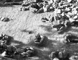 - sur le champ Koumarianou, on a fouillé un édifice de plan carré (long. 6,60 m ; larg. 5,40 m), construit en appareil pseudo-isodome de pierres plates. À l’extérieur, le bâtiment est recouvert d’un empierrement, au-dessus duquel ont été découvertes onze tombes à ciste et huit tombes à tuile de nourrissons et de petits enfants (fig. 1). Parmi le mobilier, on compte des figurines de terre cuite d’oiseaux, des modèles de meubles, de la céramique, des fibules en bronze et en fer, des colliers en fer et des coquillages marins. Ces tombes, qui paraissent être disposées en petit tumulus, datent du IIIe s. av. J.-C. Le mobilier issu de la fouille du bâtiment carré, des fibules arquées et de la céramique peinte archaïque, suggère que celui-ci existait avant l’aménagement des tombes. On a fouillé à proximité deux tombes à tuile, qui comportaient des sépultures d’adultes, datées elles-aussi du IIIe s. av. J.-C, ainsi qu’une tombe à ciste orientée Est-Ouest, comportant une sépulture d’adulte en position allongée avec cinq vases, une monnaie de bronze et un couteau en fer, datée du début du IIIe s. av. J.-C.