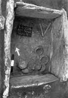 - sur le champ G. Dionysiou, au Nord de la magoula, on a dégagé les vestiges de bains romains, composés d’hypocaustes, d’une salle principale avec des sols dallés de terre cuite et probablement des baignoires construites, et d’une salle d’accueil ou d’un vestiaire à l’Ouest de l’entrée. À l’Est de l’édifice, la fouille a mis au jour une tombe à tuile (long. 1,55 m ; larg. 0,48 m), orientée Nord-Est/Sud-Ouest. Elle comportait la sépulture d’un adulte en position allongée, avec deux vases et une monnaie de bronze, qui permettent de dater la tombe du IIe s. av. J.-C.