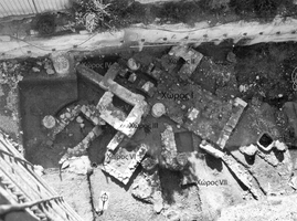- immédiatement sous cet édifice, sous une couche de destruction comportant de l’argile et des cendres, on a mis au jour les vestiges d’un complexe de bains de l’époque impériale, qui s’étend vers le Sud au-delà des limites du terrain fouillé (fig. 1). La partie fouillée correspond au tepidarium ou au caldarium, dont l’hypocauste et une toute petite partie du sol de circulation sont préservés.
