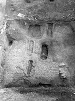 On a fouillé six tombes à fosse, dont deux avaient des parois revêtues de briques crues qui formaient un rebord supportant la dalle de couverture (fig. 2). Le mobilier recueilli comporte des vases en terre cuite ainsi que des bijoux et des objets métalliques : un epistomion en or, deux bracelets en bronze, des perles biconiques en bronze et un pendentif en fer.