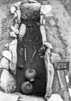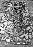 Près de la commune de Néa Philadelpheia, V. Misaïlidou (XVIe éphorie des antiquités préhistoriques et classiques) a achevé la fouille de la nécropole de l’Âge du Fer au bord du fleuve Gallikos (cf. BCH 124 [2000], p. 924) et a mis au jour, en 2001, 448 nouvelles tombes. Comme dans le reste de la nécropole, on a dégagé une majorité de tombes à ciste et de tombes à fosse, ainsi que des inhumations libres. On a également fouillé cinq tombes maçonnées en pierres non taillées ou en galets (fig. 1), et une tombe en pithos. Les crémations restent rares, puisque seulement 16 urnes cinéraires ont été trouvées. Le mobilier recueilli dans seulement la moitié des sépultures, se compose de céramique commune, de bijoux en fer, en bronze et en or (boucles d’oreilles, sphécotères, colliers et perles, bracelets à spirales ou droits, bagues, fibules, épingles, boutons en bronze doré, et quelques epistomia en or), d’outils (poignards en fer, pesons en terre cuite). On signale particulièrement un cas d’inhumation multiple (tombe à ciste 2076 ; fig. 2), rare pour cette nécropole, qui contient l’inhumation d’une femme et de deux nourrissons accompagnés de mobilier varié. On note en outre la présence de quelques tombes postérieures : une de l’époque romaine et cinq de l’époque classique et hellénistique.