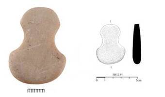 La fouille dans les deux secteurs explorés montre que l’habitat du Chalcolithique Récent s’étend vers le Nord et que, comme les phases ultérieures du Bronze Ancien I/II, il a été détruit par les crues de l’Imbrasos. Ces catastrophes naturelles constantes ont mené à la construction, au BA III (2150-2000 av. J.-C.), d’une fortification d’une largeur de 2 m et d’une hauteur de 1,64 m, fondée directement sur le sol naturel. Cette construction constitue également la limite de l’habitat de la phase Heraion V à l’Est. Parmi le mobilier appartenant à cette phase, on signale une figurine en marbre (fig. 7), une fusaïole ornée, une coupe-Depas, ainsi que des askoi à décor inscrit. La découverte des limites orientales de l’habitat permet en outre d’observer que celui-ci s’étendait, au Bronze Ancien, entre les deux bras de l’Imbrasos, sur une surface approximative de 35 000 m2 (fig. 8).