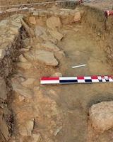 Rempart. – Dans le secteur du rempart (T1.1), la fouille avait pour objectif l’exploration de la couche de tuiles laconiennes mise au jour en 2012. On a constaté que la couche s’étend sur une grande surface vers le Sud. Elle a livré très peu de céramique, principalement des tessons de l’époque archaïque. On signale une petite phiale à vernis noir entière datée du Ve s. av. J.-C. La poursuite de la fouille dans ce secteur a ainsi confirmé la mise au jour d’une porte du rempart, flanquée, du côté interne, par des pièces couvertes.