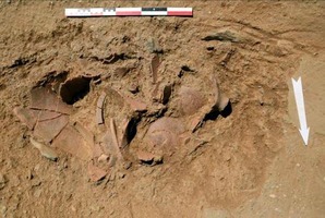 À peu de distance de la première tombe à enchytrisme, une deuxième tombe a été fouillée (fig. 6). Deux vases ont été découverts, une amphore et une lékanè datées de l’époque archaïque, l’une disposée dans l’autre, formant une surface plus grande pour y déposer la dépouille du nourrisson ou de l’enfant. La tombe, perturbée, ne comportait pas de mobilier et aucun squelette n’y a été trouvé.