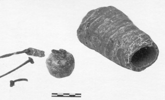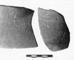 Une partie du sol de l’espace fouillé, correspondant à la roche-mère, a été dégagée. Les trouvailles ont confirmé la datation de la forteresse à la période protobyzantine. On a retrouvé des tessons d’amphores – surtout de type égéen (à corps globulaire portant des cannelures serrées au niveau de l’épaule), de marmites, de petits vases à une anse, ainsi qu’un fragment de lampe à décor végétal en relief. Un tesson d’épaule d’amphore et un autre d’un petit vase à une anse portaient des restes d’inscriptions (graffiti) protobyzantines (fig. 1). Une fibule arquée en fer, des charnières en fer, des clous, un poids de bascule en plomb (950 g ; fig. 2) et trois décanummia en bronze y ont également été retrouvés.