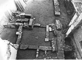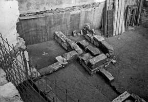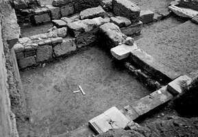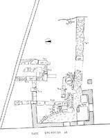 The lower foundation courses of the south end of a large house were identified in the northwest of the plot, with an entrance and adjacent staircase to the first floor. Part of a peristyle courtyard lay to its south, and sections of areas to the east and west of the courtyard, all built with architectural spolia. A destruction layer contained numerous fragments of wall paintings, bronze coins of the 2nd-1st centuries BC, and pottery of the late 1st century BC. A cistern had been cut into the northeast corner of the courtyard, its mouth covered by a T-shaped block.