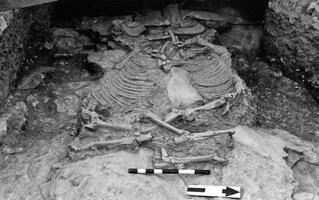 Dendra. E. Pappi (Δ’ ΕΠΚΑ) reports the discovery of a horse burial close to chamber tombs 2, 15 and 16 during cleaning in the northern part of the cemetery. A pair of horses (horses 5 and 6) were buried to the east of the pair 1 and 2 excavated in 1977. Four large irregularly shaped stones covered the eastern half of the grave, but cannot securely be associated with it. The horses were laid, confronting each other, directly on bedrock. The few sherds found by their back legs include plain Mycenaean kylikes. West of horses 3 and 4 from the 1977 excavations, between the dromoi of chamber tombs 15 and 16, was a collection of disarticulated horse bones from three or four individual animals. These finds increase the number of primary horse burials to three (with a pair of horses in each), with three to four displaced burials.