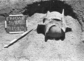 Une des inhumations à enchytrisme a été découverte dans la partie Sud-Ouest du champ ; il s’agissait d’un bébé enterré dans un vase cantharoïde non décoré du début de l'Âge du Fer (fig. 1). Les deux autres ont été retrouvées dans la partie Nord-Est du champ ; l’une consistait en deux braséros à deux pieds placés face-à-face (fig. 2), l’autre en un pithos à fond pointu et à décoration plastique bouché par une pierre plate (fig. 3). Elles ne contenaient ni restes humains (peut-être en raison de la composition du sol) ni mobilier funéraire. Un autre pithos du même type et de même époque, retrouvé en place à proximité, pourrait avoir servi pour le stockage dans une structure non conservée.