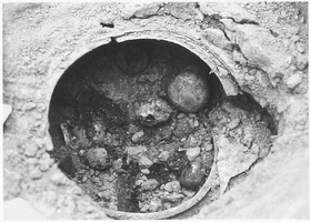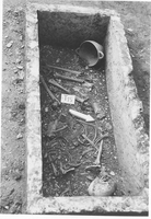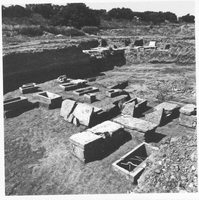 Tombs began to be located 1.87m below the modern surface, with no evidence of later activity in the area. As in the north cemetery, they were oriented either north-south or east-west. Depending on their depth, they were variously intact, damaged or looted. One was decorated with a red band around the interior. While there is no evidence for grave markers, a few vessels were placed outside the grave (on the cover slab of tomb 14, around the edge of tombs 21 and 60, or both in the case of tomb 55). Outside tomb 27 were traces of a pyre with no associated objects.