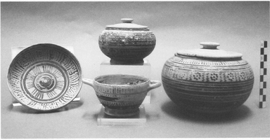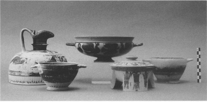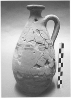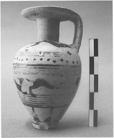 The majority of the vases so far studied date from Middle Protocorinthian II (ca 670-650 BC) to Late Corinthian I (ca 570-550). The following observations are based largely on the portion of the material so far conserved and studied. Of the 24 graves with offerings, 16 had up to three items and 8 more than three (the greatest quantity, 14, is in tomb 62). Only aryballoi appear in the two seventh-century tombs (9 and 20), while kotyles and oinochoae (broad-bottomed trefoil forms, handmade Middle Protocorinthian plainware forms and monochrome round-mouthed types of late sixth century - many with lids) predominate in sixth century graves. Other shapes represented in adult and child graves are pyxides (straight-sided, rounded and tripod) with lids (tombs 17, 18, 55 and 62) and kylikes (tombs 18, 55 and 62), plus a mid sixth-century monochrone one-handled cup, a Late Corinthian I omphalos phiale and a lekythos. Only one minature vessel (a Late Corinthian I amphoriskos) was found, aryballoi do not feature in sixth-century graves, and there is no evidence of Attic imports or influences.