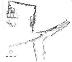 South of the shrine were two further north-south parallel walls (11 and 13) of the same construction and at the same elevation, over 21m in length. Two further walls in the intervening area were found very close to the modern surface: one of these is over 35m long and may have been intended to divide the plot. These latter walls cannot be securely dated (pottery around them is of various periods to Early Christian), but they are assumed to be post-Classical.