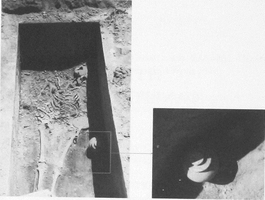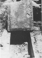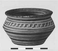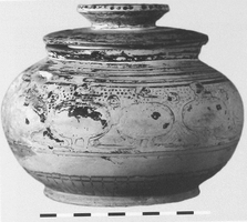The sarcophagus contained a single inhumation in extended position and two Early Corinthian vases, a pyxis-kalathos, and a pattern pyxis with convex walls (without handles) with warrior group decoration on the body and a ram-bearer on the lid. Although the stratum below the sarcophagus did not contain pottery, sherds collected from the trench around and above it include decorated Archaic Corinthian material such as warrior group aryballoi.