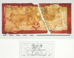 Phaneromeni, Chiliomodi. E. Korka (Ministry of Culture) publishes a monolithic Archaic limestone sarcophagus with a painted scene on the interior of the lid, discovered in situ during the opening of a water channel in 1984, at a site in the territory of ancient Tenea. The interior walls of the sarcophagus (interior dimensions 1.7 x 0.69m, depth 0.5m; lid 2 x 0.9m, thickness 0.15m) were plastered and had painted decoration of two horizontal red bands separated by an off-white band. The scene on the interior of the lid, set within a wide red border, depicted (in purplish-black and red paint on a white ground) two confronted lions with heads turned back and raised paws, over a central red and yellow palmette.