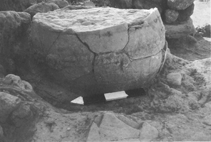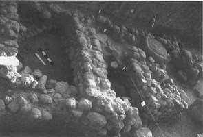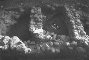 Walls defined small rooms (none of which has yet been completely exposed). Built of unworked stones of varying sizes, with two faces and a fill of smaller stones, they were generally preserved to a height of four courses (0.7m), although excavation is not yet complete. The largest room is ca. 4.8 x 2.3-2.5m (the south side is unexcavated), with a doorway on the west side preserving a stone hinge block for a probably wooden door: the room contained sherds of large pithoi. Ca. 0.8m to the north, most of a large pithos decorated with two impressed ‘rope’ bands was found in situ (similar decoration was also found on other sherds). Preliminary examination of the pottery suggests that it was not wheel-made. Vessel shapes represented are bowls, plates and typical Early Helladic bird-shaped ‘saltcellars’ (which have close parallels for form and fabric in ancient Corinth). Many sherds have red, light brown or grey-black slip: different fabrics are represented, from a reddish fabric with many inclusions, to the very fine fabric used for thin-walled vessels. Other finds include a round pyxis and three conical spindle whorls. A notable quantity of Melian obsidian was recovered, mostly blades (over 50, plus two flint blades). The use of bronze and lead is also attested.