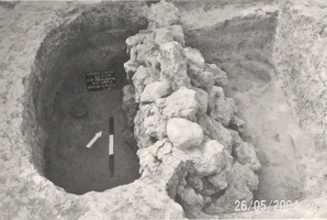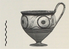 To the northwest, 170m away (in the west part of the excavation plot), the remains of at least two destroyed burials were found, in the form of a layer of tumbled stones and LHIIB-IIIA1 pots and sherds close to the surface (finds include a thilastron, a kernos and a round-bodied jug). In situ in a hollow (at a depth of 1.5m) were an LHIIB goblet and three-handled jar.