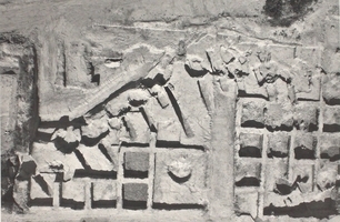 This part of the cemetery was defined to the southwest by a retaining wall of a single row of limestone blocks. A pit (2.89 x 0.45/0.6m) cut into the rock parallel to, and in contact with, the unfinished rear face of this wall contained two terracotta figurines - a standing male figure (interpreted as Pluto by the excavator) wearing a chiton and chlamis and holding in his right hand a cornucopia, and a garlanded female (seen as Persephone).