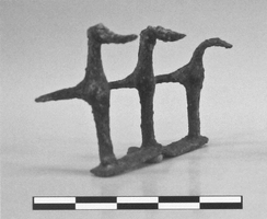 Following geophysical prospection in 2005, a further area of the Mycenaean cemetery was located and excavated as sector B. Twenty-two collapsed and partially preserved tombs were found, 19 of which were chamber tombs were dromoi closed without dry stone walls, one was a similar chamber tomb without the closing wall, one a double cist, and one a half-finished chamber. The tombs were dug into the bedrock and closely spaced in two rows running southeast-northwest. Two streams had partially washed them away. A total of 230 LHIIB-LHIIIB2 vessels were recovered, including jars, amphorae, goblets and kylikes, thilastra, cups, a bridge-spouted cup, stirrup jars, bridge-spouted and cut-away necked jugs, large jugs, a handleless jar, an askos and kernoi. In addition, 11 bronze items were found (a knife-axe, swords, knives, needles), two gilded bronze nails, 84 beads, 62 spindle whorls of steatite or terracotta, and a phi figurine. Eleven tombs produced skeletal remains from primary or displaced burials. In general it is noted that pottery from the cemetery shows connections to the northwestern Peloponnese (chiefly Achaia) as well as to the Argolid and Attica.