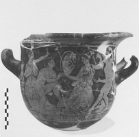 The majority of tombs produced evidence of ancestor worship continuing from Late Geometric to Early Hellenistic times in the form of pottery (hydriae, krateriskoi, skyphoi, kotyles and oinochoe) and bronzes (pins, mirror discs and a Late Geometric figurine with three birds in a row) found in layers with burnt soil and carbonized wood over the burials and below/between the fallen stones of the superstructure. A round well opened to the southeast of the burial chamber of Mycenaean grave Ia, which was excavated to a depth of 7.5m, had been used to deposit offerings: it contained Classical pottery (mainly hydriae) and bronze sheet between layers of burnt earth and carbonized wood. Late Archaic and Classical pottery and small bronzes, plus much domestic pottery and loomweights, were collected from stream 1 and the chambers of tombs Θ, Ι, Ια and Ιβ. From the streambed came a red-figure bell krater of the first quarter of the fourth century, depicting a Dionysiac thiasos and on the reverse three draped youths.