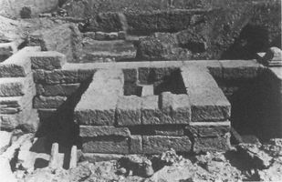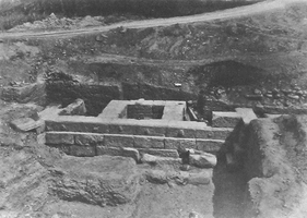 South of the funerary monument, part of an ancient road ran east-west, with wall foundations and a covered stone water channel. At least two building phases predated the funerary monument.