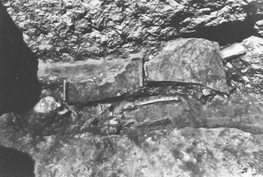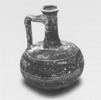 Two successive graves were found in the west compartment of the tomb structure. The older (AX) a stone larnax covered with two slabs, contained two inhumations. The first was accompanied by a stone vessel, two lagynoi, an unguentarium, lamp, pyxis, phiale, two Lydian amphoriskoi (all of late third- to second-century date), and metal items (a needle, ring, mirror disc, lead aryballos, earring, lance or arrowhead, and an iron dagger): the second held a frying pan, carbonised material round the cranium, and nails probably from a wooden bier. An iron strigil, a phiale, and 32 astragaloi cannot be ascribed to either individual. The overlying tile grave (AVI) had two use phases: the lower contained many scattered cranial and bone fragments, a small bowl, an unguentarium, and bronze fragments. The upper contained a single inhumation with a late second- to early first-century globular vessel, fragments of a bronze object, and much carbonised material along the east side of the tomb. In the east compartment, grave AVII (second half third- to second-century) contained one inhumation with two lagynoi, a lopas, an unguentarium two Lydian amphoriskoi, a bowl, a pyxis and lid, a lamp and a strigil.