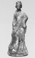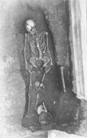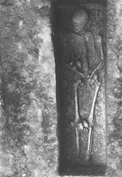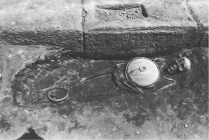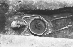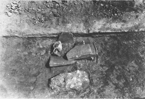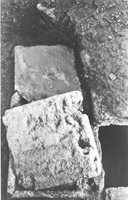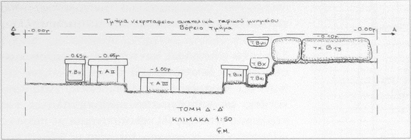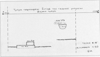 To the north, by the back face of the monument, was a group of five tombs (three tile-covered cists and two with no preserved cover, containing the inhumations of four adults and a child). B1, the child burial, contained a kantharos, lopas, lekanis, globular unguentarium, and a small sword dating to the second half of the first century BC, plus nails (probably from the bier) and bronze fragments. At a slightly greater depth lay a row of three graves: BV (second- to first-century) contained pottery (a trefoil-mouthed oinochoe, lagynus, lopas, unguentarium, pylis, small bowl, lamp, and two Lydian amphoriskoi), a gold danake in the mouth, and fragments of iron and bronze; BIII (late second- or early first-century) contained a gold danake in the mouth, plus pottery (an unguentarium, chytra, two Lydian amphoriskoi, a lidded vessel, a lamp, and a small bowl), a bronze needle, a bronze coin, six nails, a gold sheet and a bronze fragment; BIV (end first-century BC to early first-century AD) contained two unguentaria, a large lidded open vessel, a chytra, gold sheet, a lead vessel, a bronze bowl, bronze sheet and bronze and iron fragments, two nails and a sea shell. Grave BVI (second half second-century to early first-century) lay below BV and contained a large lidded open vessel, a chytra, three unguentaria, a lamp, a strigil, and bronze and iron fragments.