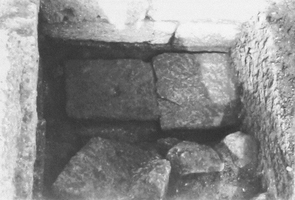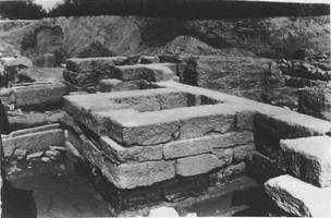 A Π-shaped funerary monument (built in the mid third century) consisted of an open ‘court’ defined by isodomic walls preserved to four courses (at the level of the krepis, estimated at 7.8 x 4.35m). The superstructure is not preserved. Inside, a tomb structure (4 x 3.6m) built onto the rear wall was divided into two burial compartments which held the burials of at least five individuals dating from the late third to the last quarter of the first century BC (plus displaced bones from older burials). Beneath this, two chambers defined by the walls of the monument also contained burials.