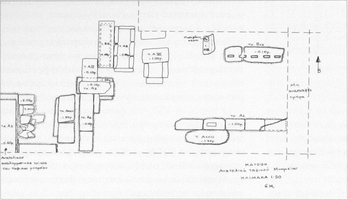 East of the monument lay 13 tombs in total (six tile-covered simple cists, a simple cist covered with tiles and a limestone slab, four cists with limestone cover slabs, a sarcophagus, and one built tomb). Tomb AVIII, a rock cut cist of the second half of the second century, was set against the east wall of the monument: it was covered with spolia including a grave stele, and had one pot as an offering on the west side. The cist contained on the east side a cranium with associated bone, a lamp and a mass of iron, and on the north (0.3m deeper) an undisturbed inhumation with two pyxides, two unguentaria, two lagynoi, two Lydian amphoriskoi, a small bowl, three further pots and one unspecified offering. The cist AXXIV, to the east, had one cover slab in secondary use: in the north of grave were two crania and associated bones with a bowl, pyxis lid, small bowl, prochous, unguentarium, lamp, iron dagger or strigil, and carbonised material. A previous burial phase (second half of the second-century), below this, had a single inhumation with a gold danake at the mouth, plus five unguentaria, two skyphoi, three small phialae, two lamps, a pyxis, two miniature Lydian amphoriskoi, a relief bowl, and nails from the bier. A wall lay 2.1m east of the monument, and to the north of it, grave AIV (a cist built of small unworked stone and tile, containing a single inhumation with three unguentaria, a coin, and nails, dating to the first half of the first century BC): outside the grave, in the northeast corner, was a cranium together with sherds. A group of eight graves lay to the northeast of the monument, beyond the wall (and west of a further wall which had five cuttings probably for grave stelai). Grave BII, a stone sarcophagus (the contents of which were disturbed), contained two crania and a few other bones, four globular unguentaria, two lamps, two strigils, and two pieces of iron sheet, dating to the second half of the second/early first century BC. Grave AII (end second- to early first-century), immediately to the east, was a cist with stone cover slabs which contained a lopas, lidded lekanis, small skyphos, amphora, two unguentaria, two Lydian amphoriskoi, two lamps, a comb, nails, and burnt wood. Grave AIII was a built cist with second-century pottery. BVII, a tile-covered cist, contained a single inhumation with a very little non-diagnostic pottery. Cist grave BX contained three gold danakes (one of which was placed on the mouth), a lidded chytra, lamp, lagynus, kyathos, miniature alabastron, two unguentaria, and a peg. The second half second-century cist grave BXI lay below BX: one vessel was placed on the cover slab, while the grave contained a gold wreath on the cranium of the deceased, two lamps, three unguentaria, a lopas, two lagynoi, a gilded bronze bracelet with snake-head terminals, a nail and bronze fragments. West of graves BX and XI, a lead kalpis contained bone: below this was a built cist grave BIX containing two bones, a little pottery and an iron knife. Few details of cist tomb BVIII were recorded. Grave AXXIII was a rock-cit cist parallel to the wall east of the monument (which was cut to hold the grave stele): a kalpis/hydria and a bronze item were placed over the cover tiles, with a skyphos immediately below them, and accompanying the burial a lidded lopas, a small bowl, Lydian amphoriskoi, three lamps, an egg and a strigil. No details are recorded of the tile-covered grave AI.