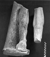 En 2009, K. Sismandis (XVIe éphorie des antiquités préhistoriques et classiques) a poursuivi la fouille programmée de l’ensemble désormais connu sous le nom de Sébasteion de Kalindoia. Le dégagement de la huitième pièce au Sud de l’ensemble a été achevé tandis que celui de la neuvième a été poursuivi (fig. 1-3). Ces deux pièces appartiennent à la même phase de construction et sont contemporaines de la septième pièce : toutes ont des dimensions et des techniques de construction similaires. Les murs en pierres des pièces 8 (ou H) et 9 (ou Θ), épais de ca. 0,70 m, sont conservés sur une hauteur variant entre 0,20 et 1,40 m. Seul le mur de fond Ouest de la pièce 8 porte des traces d’un épais enduit. Immédiatement sous le sol de terre battu des pièces a été mis au jour un mur épais (0,80 m) qui traverse les deux pièces obliquement, de l’angle Nord-Est de la pièce 8 à l’angle Sud-Ouest de la pièce 9 : il appartenait probablement à une construction importante de l’époque hellénistique. Alors qu’aucune base de statue n’a été retrouvée devant la salle 8, une base a été retrouvée en façade de la pièce 9 (fig. 4). Elle poursuit ainsi la série des bases découvertes devant toutes les autres pièces du Sébastéion. On ignore la destination originelle des pièces 8 et 9, mais elles devaient être richement décorées si l’on en juge par le nombre important de fragments de placages de marbre et d’enduit peint retrouvés lors de leur fouille. L’absence de bases de statues devant la pièce 8 est due à l’utilisation ultérieure du secteur, dont témoigne la présence d’un seuil (1,00 x 2,50 m), reposant sur du mortier hydraulique, exactement devant le mur de séparation des deux pièces. En effet, lors d’une seconde phase, la cloison entre les deux pièces a été supprimée et de nouveaux murs de pierre bâtis à l’intérieure des pièces 8 et 9 ont défini une pièce de 5,10 x 12,90 m, à laquelle correspond le seuil. Les fouilleurs émettent l’hypothèse que ces nouveaux espaces – délimités par les nouveaux murs et les murs extérieurs des anciennes pièces 8 et 9 – étaient utilisés pour les banquets, comme la pièce 4 (ou Δ) du Sébasteion. Il s’agirait alors d’un de ces τρίκλεινα évoqués par un décret honorifique de Kalindoia du Ier siècle apr. J.-C. Les importantes quantités de céramique, de coquillages et d’os d’animaux trouvés dans ces pièces confortent cette hypothèse. Parmi les trouvailles, mentionnons la partie inférieure d’une statue masculine de grande taille (hauteur conservée : 0,61 m ; fig. 5) de type militaire, dont un premier fragment avait déjà été trouvée en 2008.