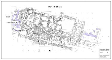 À l’Est du bâtiment D, les travaux se sont poursuivis dans le carré D2 (fig. 1,7), où le mur à l’intérieur du portique a été nettoyé en surface. Conservé sur une faible hauteur, il était construit en blocs de remploi.
