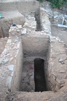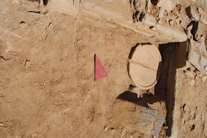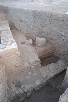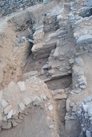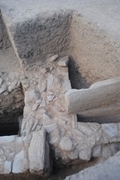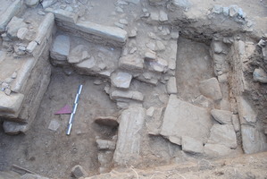 À l’Ouest du bâtiment D, on a poursuivi la fouille contre le mur 6 (haut. 1,10 m) qui avait été mis au jour en 2012 ; il dispose d’une baie et appartient à une pièce semi-souterraine (fig. 2).