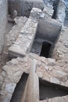 Sur la terrasse inférieure, la recherche s’est poursuivie au Nord de la basilique (fig. 8), où l’on avait mis au jour une pièce orthogonale (pièce 1). On a dégagé la suite de la canalisation en terre cuite qui était recouverte de plaques, ainsi que le pavement d’une largeur de 0,85 m à l’Ouest, mis au jour en 2012. La fonction du pavement n’a pas été clarifiée, mais on sait qu’il est lié à la pièce 1, au Sud.