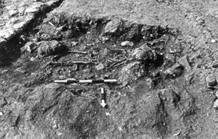 Une inhumation simple d’enfant, effectuée sans doute après l’abandon de l’installation, a également été découverte dans un large couloir dans la partie Sud-Ouest du bâtiment décrit (fig. 3). Le défunt était enterré sans mobilier, allongé sur le dos, la tête orientée à l’Ouest et reposant sur une tuile.