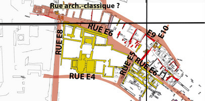 L’inventaire des murs s’est poursuivi en 2014 dans le secteur à l’Est du sanctuaire, entre les rues E9 et E4 à partir du péribole Est, à la hauteur de la porte D, jusqu’à l’extrémité de la zone fouillée au XIXe s., environ 80 m plus à l’Est (fig. 2). Ce secteur est composé de deux terrasses, séparées par la rue E6, orientée Est-Ouest, et par un réseau de rues Nord-Sud. Les fouilles du XIXe s. dans ce secteur avait mis au jour les thermes de l’Est et le bâtiment aux latrines. Dans les années 1950, J. Bousquet et L. Lerat ont exploré le quartier d’habitation entre la terrasse Est, le bâtiment aux latrines et la terrasse Est. L’analyse détaillée de ce secteur, dont la plupart des murs ont été reconnus montre que le réseau de rues remonte à l’époque archaïque au moins, mais qu’il a connu des modifications de détail. La construction du double ensemble des thermes et de leurs annexes contenant les latrines et le laconikon appartient à un programme ambitieux, comme l’était, à la même époque, l’agora romaine. Ce vaste programme a respecté la rue 5 qui, pourtant, séparait les deux bâtiments.