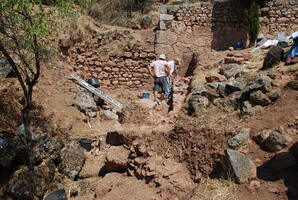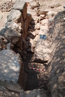 Dans le secteur 3, où l’on avait mis au jour un mur d’orientation Est-Ouest (mur 316), la fouille a montré en 2014 que celui-ci était associé à un épais remblai qui pourrait être identifié à une voie passant à l’arrière du bâtiment protobyzantin. Le matériel recueilli à sa surface et dans son épaisseur permet de le dater de la dernière phase de l’occupation de Delphes (VIe-VIIe s. ; fig. 7). Un sondage pratiqué à l’arrière du mur a montré que celui-ci avait été perturbé à l’époque moderne, et auparavant à l’époque protobyzantine (fig. 8) : un creusement à l’arrière du mur durant l’Antiquité tardive correspondrait peut-être à une réparation. Il est également apparu que le mur 317 se prolongeait derrière le mur 316, confirmant ainsi l’ancienneté de la ligne de rupture de pente représentée par ces soutènements.