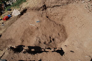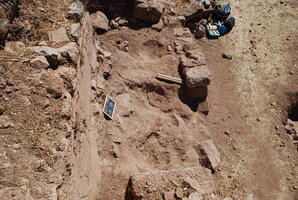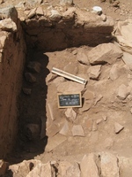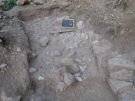 De la pièce 5, on avait dégagé en 2013 les limites, ainsi que les départs de sol sur les côtés, mais pas au centre. La fouille de 2014 a montré que la perturbation observée était en fait due à un réaménagement de la pièce. Celle-ci a été transformée en réserve, avec le creusement de trois fosses à pithoi, dont la base de l’un était en place (fig. 6). Dans les niveaux inférieurs, antérieurs au bâtiment, on a trouvé de la céramique romaine et une série de fragments d’enduits peints en rouge ou en noir.
