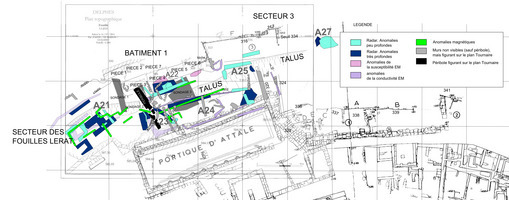 Une troisième campagne de prospection géophysique a été effectuée en 2014 dans le secteur Sud-Ouest de la ville antique de Delphes, entre la rue 20 et le musée (voir plan général, fig. 1). Plusieurs méthodes combinées (magnétique, GPR, EM et ERT) ont permis d’identifier des structures : des puits et des murs de terrasse notamment, situés à une profondeur supérieure à 1 m. Il est à présent évident que la ville antique s’étendait sur une surface comprise entre l’entrée occidentale du site archéologique et la fontaine de Castalie. Les murs de terrasse suivent le dénivelé naturel du terrain. Les structures étaient installées sur les pentes, séparées par des rues qui épousaient elles-mêmes les courbes de niveau.