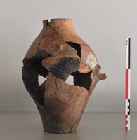 La fouille du niveau intermédiaire entre la maison du Néolithique et les premières structures en creux du Bronze Ancien, matérialisé notamment par deux grandes fosses enduites (locus 6-128 et 6-131) avait livré une quantité importante de céramique, dont quelques vases appartenant à un type non encore attesté sur le site. L’étude de cette céramique a révélé plus de 110 corrélations (collages ou rapprochements), permettant d’obtenir une vingtaine de vases nouveaux et de compléter certains de ceux déjà vus à la fouille (fig. 1-2). S’y ajoutent une demi-douzaine de collages obtenus parmi les tessons de la fouille des années 1993-1994 dans les mêmes zones (extension Nord de l’ancien secteur VIB). La répartition des fragments associés montre clairement que le remplissage de ces deux fosses et le remblai environnant appartiennent à un seul et même épisode. Par ailleurs, l’absence de tout collage ou rapprochement entre le matériel de ce niveau et celui de la maison 1 sous-jacente montre qu’il ne s’agit pas d’un nivellement/réaménagement des débris de ladite maison, mais d’un remblai qui met en œuvre des éléments issus de constructions postérieures. On observe la même chose dans le matériel architectural.