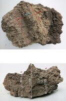 L’étude des fragments architecturaux a porté d’une part sur les fragments issus de la fosse de la couche intermédiaire (6-128), d’autre part sur les fragments issus de quatre autres locus appartenant à la couche de destruction de la maison 1. Toutes les empreintes indiquent un mode de construction des murs sur poteaux jointifs (fig. 3), confirmant ainsi les observations faites sur d’autres maisons néolithiques de Dikili Tash. On observe des rondins de 9,5 cm de diamètre, du bois de refend parfois utilisé pour combler les vides entre rondins. On constate également l’utilisation de paille comme dégraissant dans le torchis. Deux à huit couches d’enduit ont été observées.