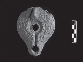 La fouille s’est poursuivie à un niveau inférieur et a révélé un mur (ép. 0,60 m) construit avec du mortier. Une canalisation en terre cuite était prise dans sa construction. Parmi les tessons recueillis dans ce niveau, on note une lampe de type micrasiatique (VIe-VIIe s. apr. J.-C. ; fig. 5).