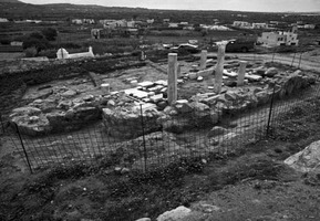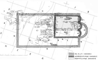 - à l’époque vénitienne, dans la partie Nord-Est de la basilique, on a construit une église plus petite, à trois nefs et probablement à coupole (long. 10,50 ; larg. 9 m). Le mur Nord de cette église est collé au mur Nord de la basilique protobyzantine. De la colonnade Nord, trois colonnes cannelées en marbre sont conservées. De la colonnade Sud restent trois colonnes à fut lisse. Le sol du sanctuaire était pavé de blocs de marbre de remploi.