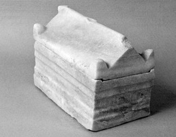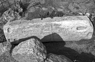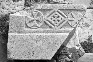 A l’Ouest de l’église, on a fouillé 20 tombes à fosse, deux tombes à ciste et deux sépultures libres. Les cistes sont construites à l’aide de matériaux de remploi, notamment des tambours de colonnes ioniques, un linteau en marbre portant une croix en relief et l’inscription ΟΜΜΟΟΥCIOC//TRIAC (fig. 6). Les tombes à fosse, creusées dans la roche à une profondeur de 0,30 m, sont recouvertes d’une dalle de calcaire ou de schiste ou de blocs de remploi en marbre. Une monnaie en bronze de l’époque franque trouvée à l’intérieur d’une tombe constitue un terminus post quem pour l’utilisation de la nécropole.