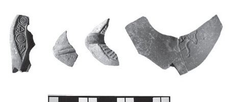 - dans un troisième état de construction, l’église s’est limitée aux deux nefs Nord. À cet état appartient un fragment de peinture murale (dim. 0,40 x 1,30 m) qui représente des écailles : il entrait certainement dans une composition d’ensemble figurant un saint tuant un dragon.