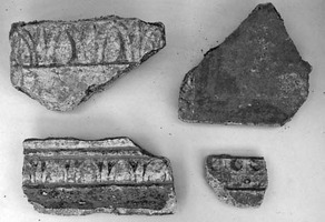 La fouille de l’îlot Sud a livré les vestiges d’un bâtiment public de l’époque hellénistique, remanié aux époques romaine et protobyzantine. Le bâtiment se composait notamment d’une grande pièce orthogonale (dim. 9,60 x 8,50 m), dont les murs Est et Nord appartiennent au premier état de construction (le mur Ouest se trouve sous la rue moderne). Ceux-ci reposent sur de solides fondations. Leurs faces internes étaient stuquées de sorte à imiter un appareil régulier. Les stucs conservés en place sont de couleur blanche, mais on a également trouvé des fragments polychromes dans les niveaux fouillés. Les vestiges de décor du couronnement des murs font apparaître des motifs décoratifs (oves et fers de lance, fleurons et frise, fig. 3). Une deuxième pièce, à l’Est de la première (dim. 6,80 x 5,70 m), appartenait au même complexe, mais ses murs sont en mauvais état de conservation.