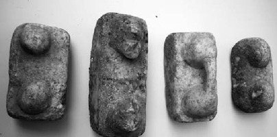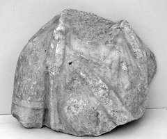 Des fondations puissantes en opus caementicium appartiennent au deuxième état de construction (milieu du IIe s. apr. J.-C. ?), ainsi que le sol de la pièce Ouest. Il est probable que le bâtiment s’étendait jusqu’à la rue Est-Ouest, mais cette partie de l’édifice a été perturbée par l’installation de constructions ultérieures, à l’époque protobyzantine et à l’époque des Chevaliers : ces murs utilisent en remploi des éléments du bâtiment de l’époque hellénistique et romaine, notamment des fragments de colonnes, et ceux d’une statue féminine (fig. 4). La découverte d’une lékanè en marbre portant l’inscription ]ΟΑΓΟΡΑ[ et de poids en marbre (fig. 5) suggèrent d’identifier le bâtiment aux archives ou à l’agoranomion.